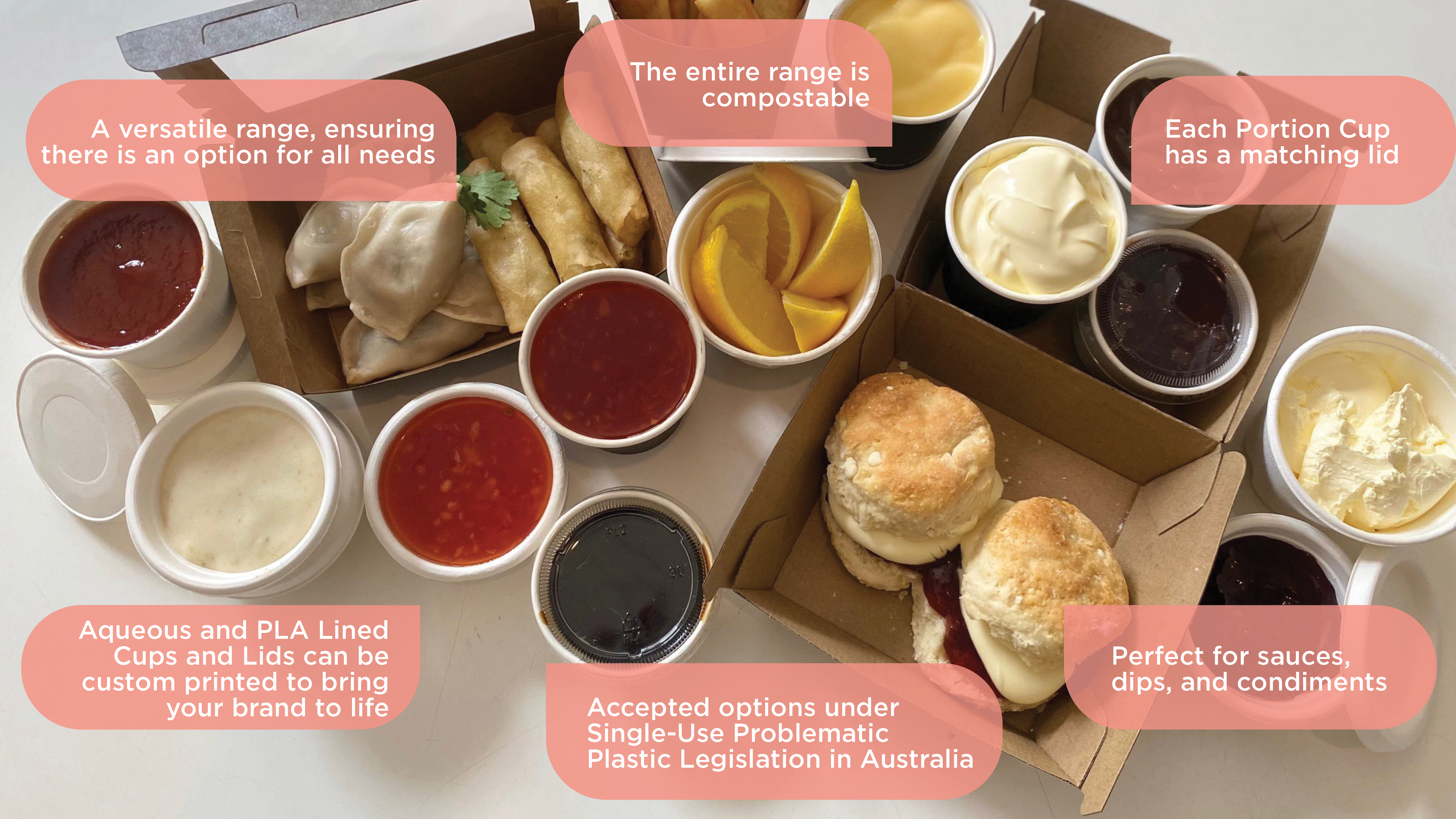 The Detpak's Portion Cup & Lid Range is the perfect solution for condiments, sauces, dips, and more. Designed with both versatility and sustainability in mind, this range includes a variety of cup and lid options. Utilising sustainable materials including sugarcane, PLA (Polylactic Acid) and compostable lining choices including PLA and Aqueous, there is a solution to suit every need. Serve your sides responsibly without compromising on quality or presentation.
