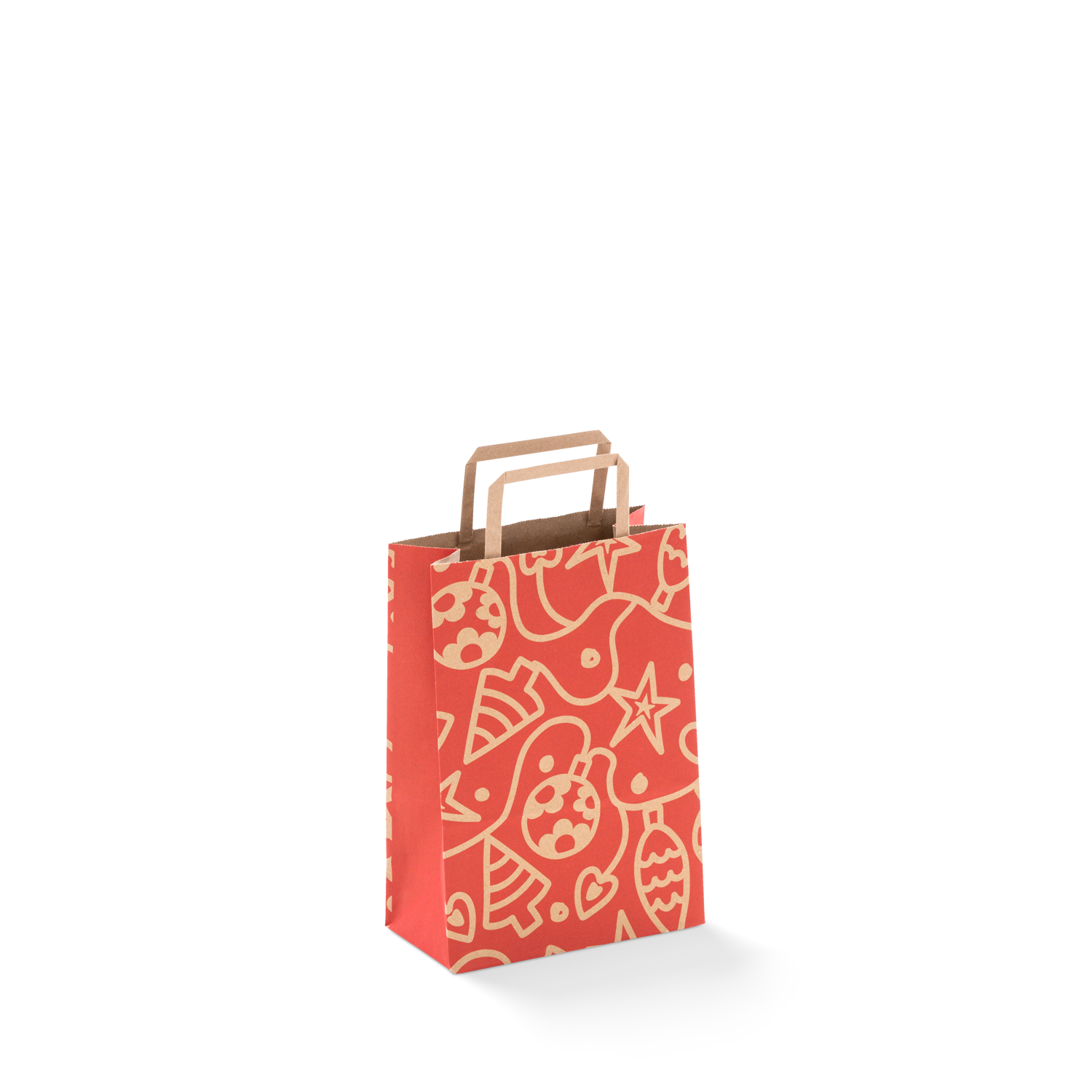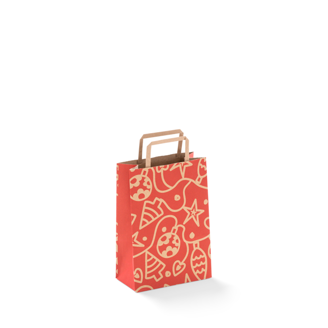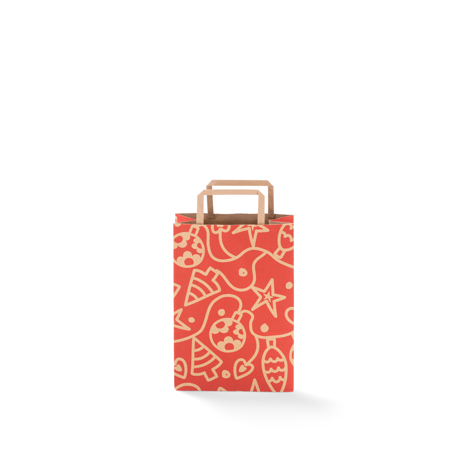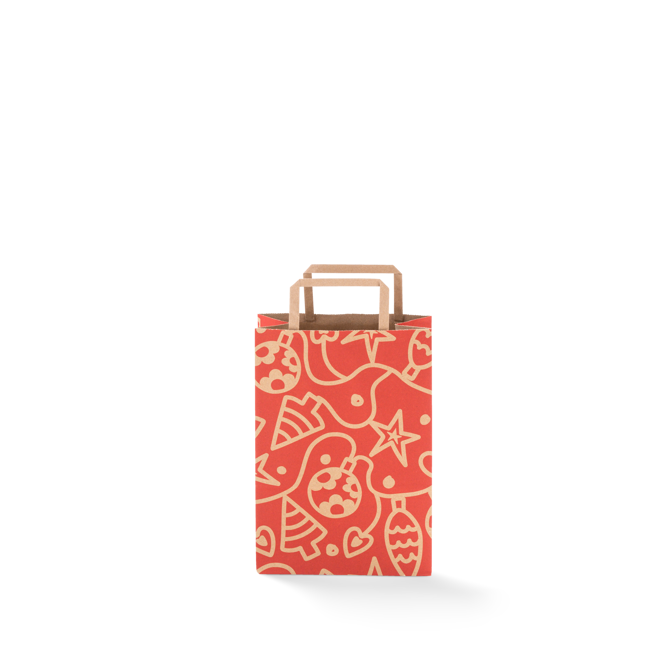 The Small Red Gift Bag #40 is made from high-quality recyclable kraft paper, featuring a Christmas Decorations design in red and brown. These Christmas paper bags with flat fold handles is an excellent choice for business owners and retailers looking for style and sustainability. Our small size paper bags are perfect for candles, jewellery, stationery, beauty products, t-shirts, coffee mugs and more.