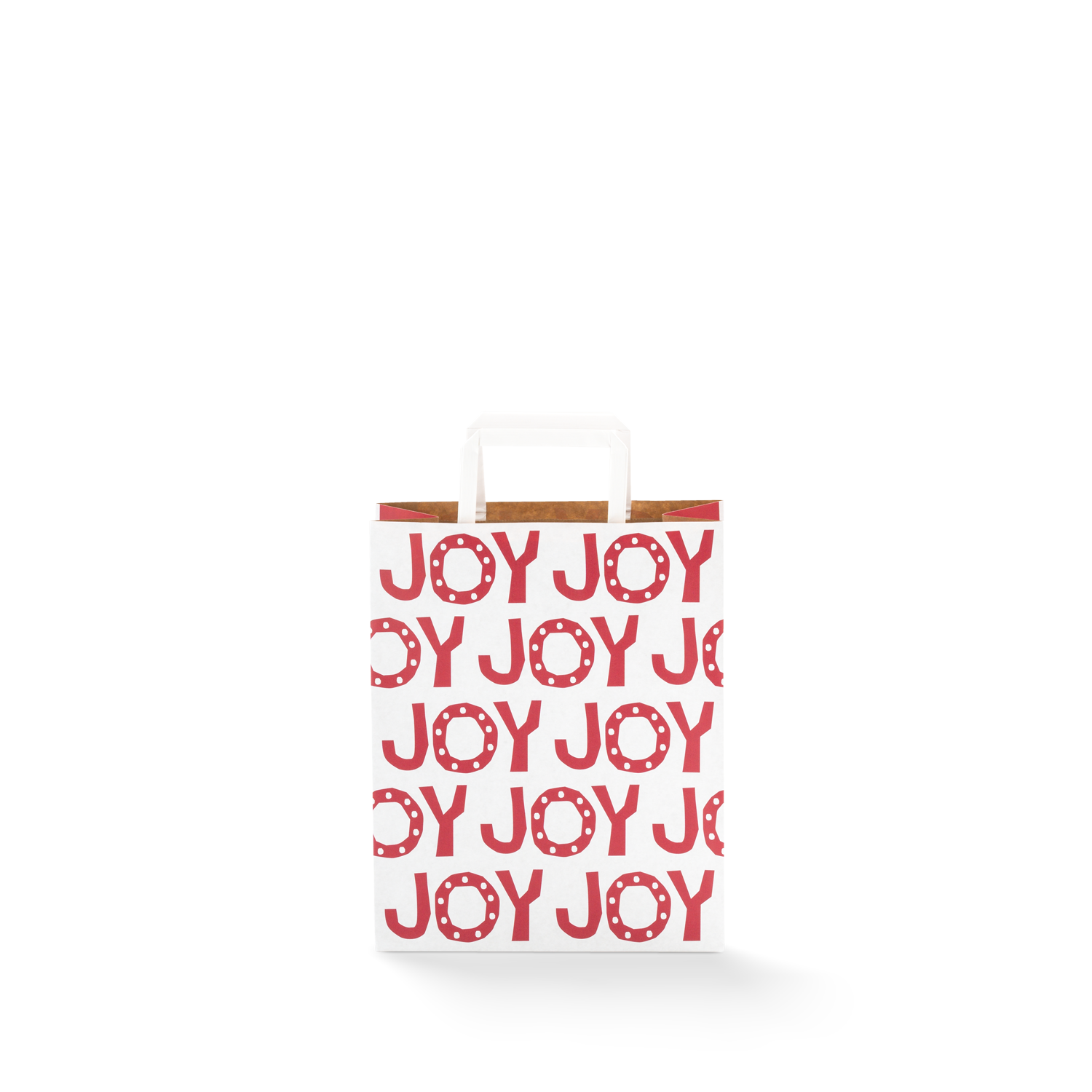The Medium Christmas Paper Bag #60 is made from high-quality duo kraft paper, featuring a 'Joy' Christmas design in red and white. These Christmas paper bags with flat fold handles is an excellent choice for business owners and retailers looking for style and sustainability. Our medium size paper bags are perfect for pair of jeans, hair care products, flyers, small homewares and more.