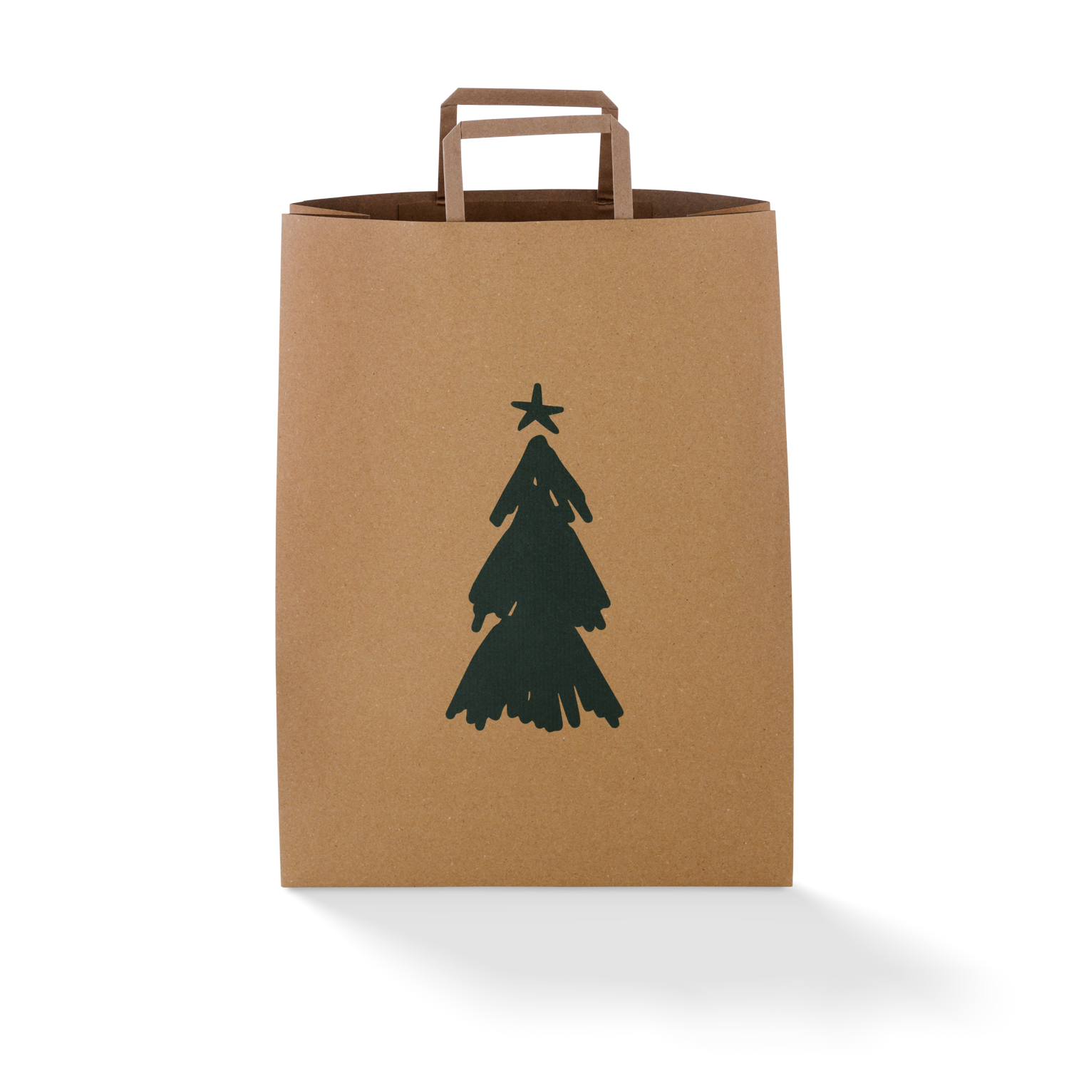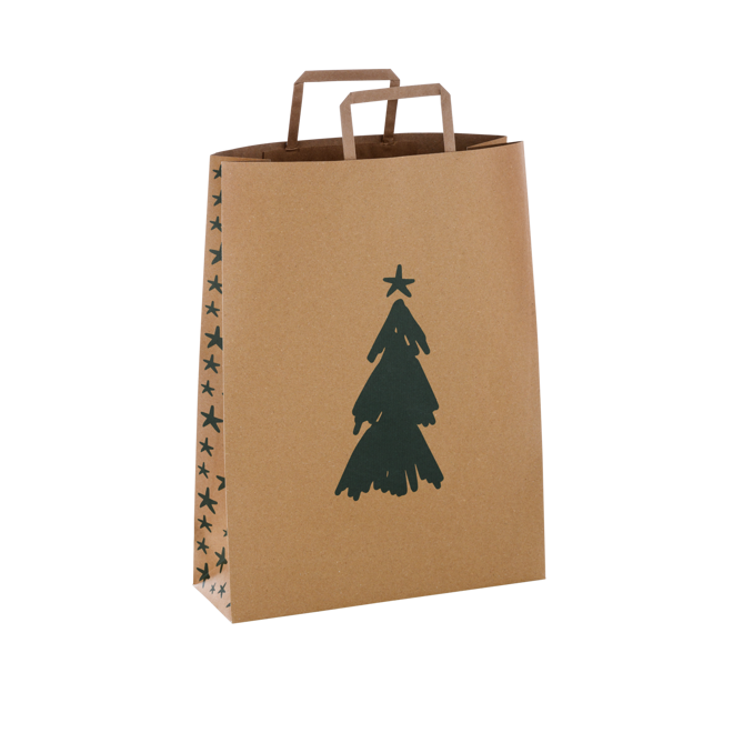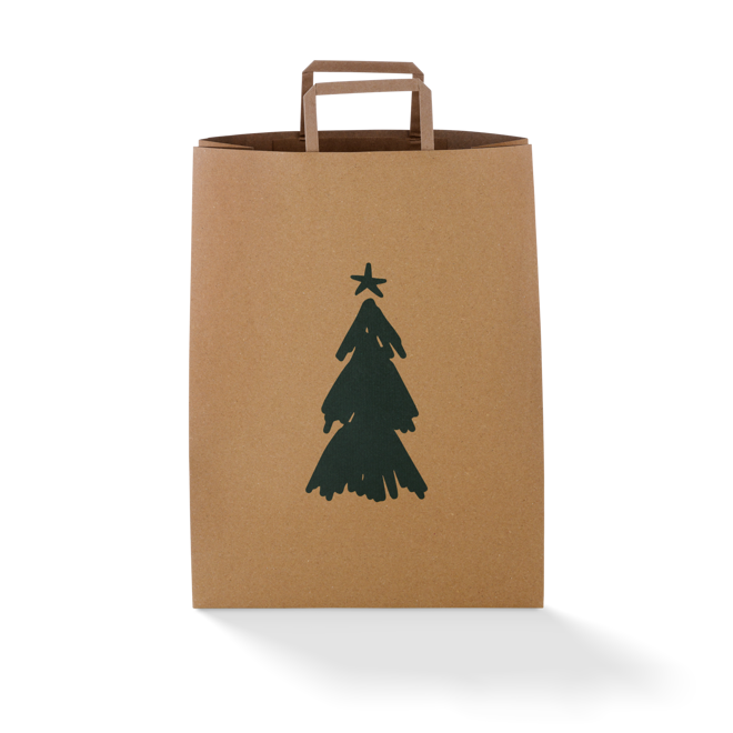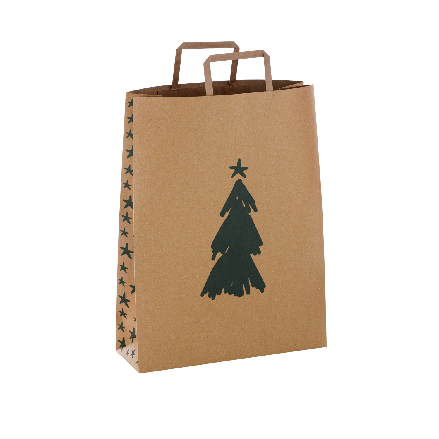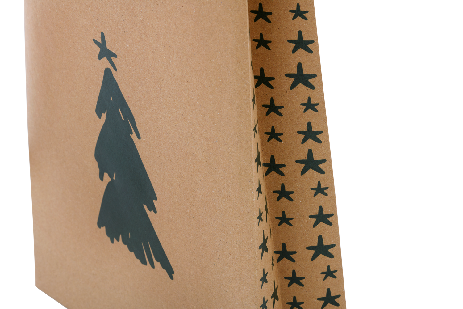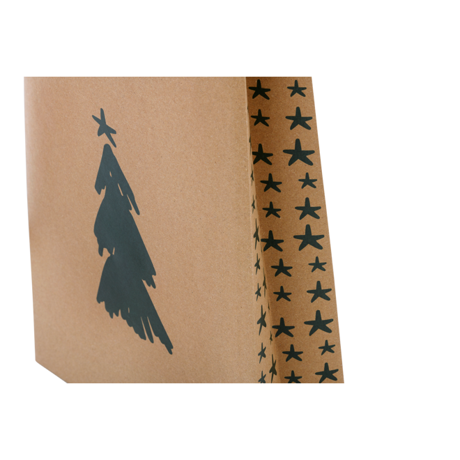 Our Large Christmas Gift Bags are made from brown recycled paper, feature a flat fold handle and hold up to 10kg. They are perfect for candles, jewellery, stationery, beauty products, t-shirts, coffee mugs and more. Paperpak's kraft carry bags are the perfect reusable solution for Chirstmas retail packaging, featuring a green Christmas Fir Tree design front and back, and green Star design in the gusset.
