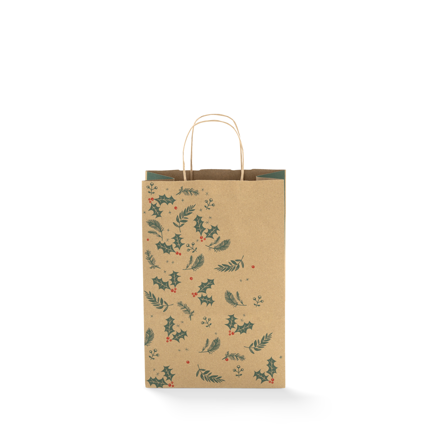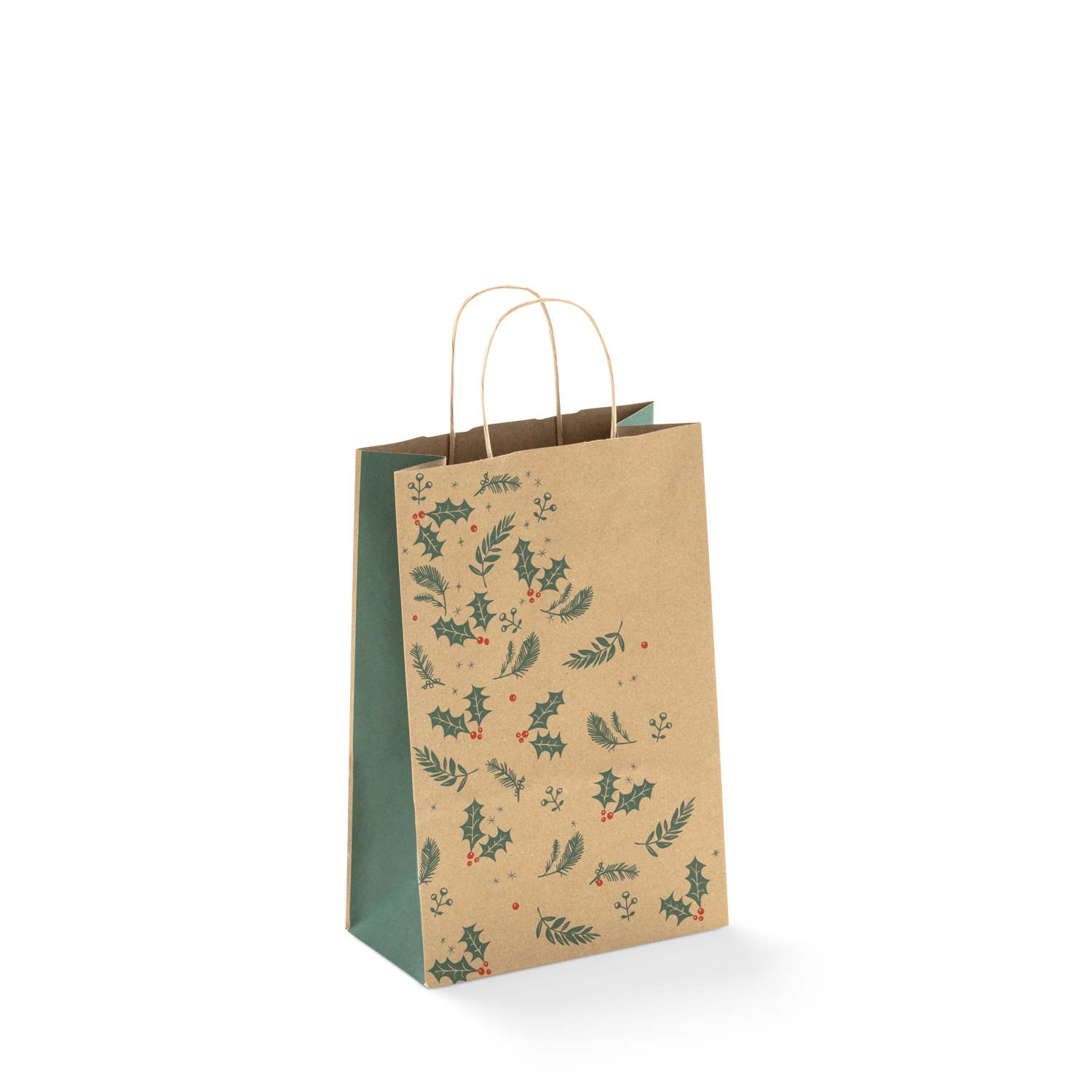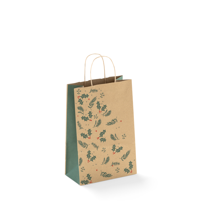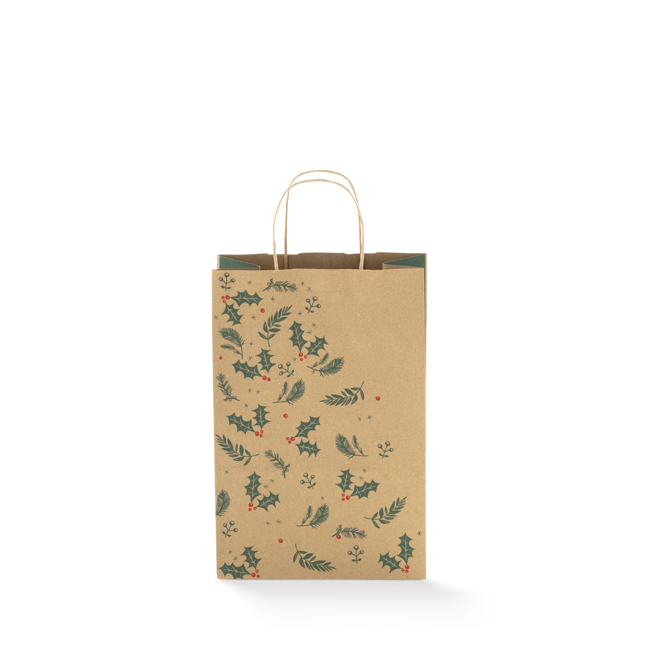 The Small Christmas Paper Bag #16 is made from high-quality recyclable kraft paper, featuring a Holly Christmas design in red, green and brown. These Christmas paper bags with twist handles is an excellent choice for business owners and retailers looking for style and sustainability. Our small size paper bags are perfect for promotional flyers, beauty products, clothing, books, small homewares and more. Shop Paperpak's small Christmas paper bags in bulk with nationwide shipping in Australia.