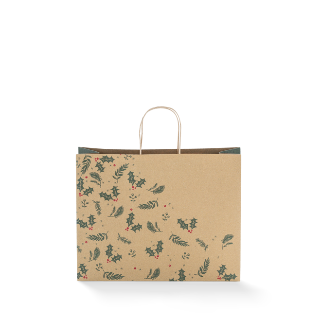 The Medium Christmas Paper Bag #22 Short is made from high-quality recyclable kraft paper, featuring a Holly Christmas design in red, green and brown. These Christmas paper bags with twist handles is an excellent choice for business owners and retailers looking for style and sustainability. Our medium size paper bags are perfect for coats, throw rugs, shoe boxes, cushion, frames, board games and more.